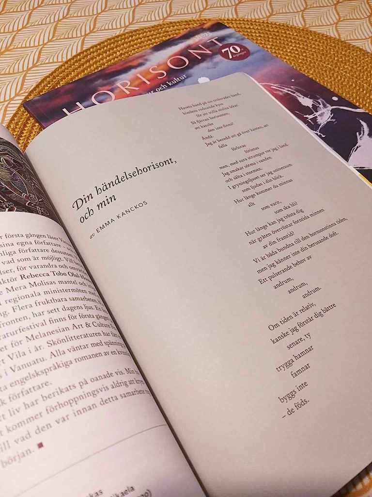 Min dikt ”Din händelsehorisont, och min” hittas i tidskriften Horisont, nr 3, 2023.